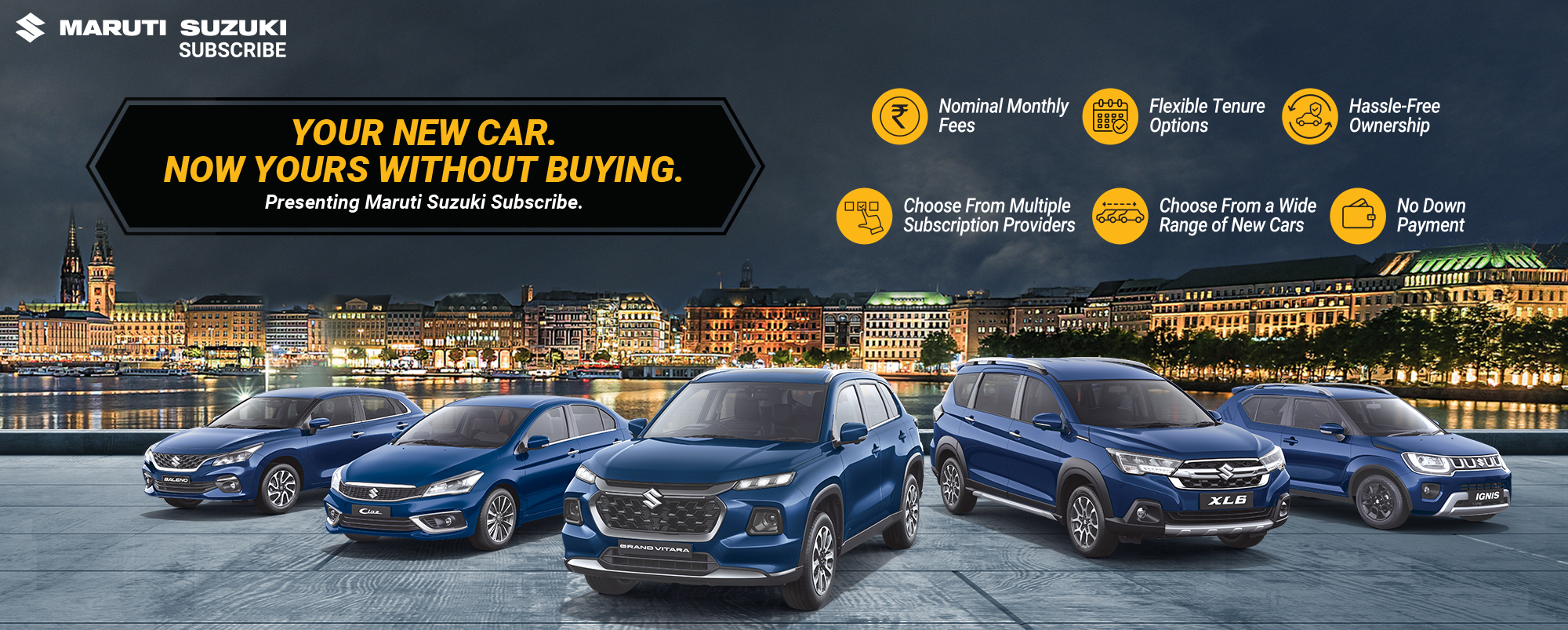 Maruti Suzuki Subscribe enables all customers to enjoy driving their preferred Maruti Suzuki cars without having to deal with all the financial responsibilities that come with owning a car.All you need to do is opt for a monthly subscription plan at a fixed monthly fee, which includes the routine maintenance and insurance costs, and choose a flexible tenure. At Sai Service in, , Kottayam, all Hatchback, Sedan, SUV, the MUV models line-up includes Baleno, Invicto, EVitara, Jimny, Ciaz, Ignis, Fronx, Grand Vitara, XL6. Here, you will enjoy Maruti Suzuki Subscribe benefits such as: